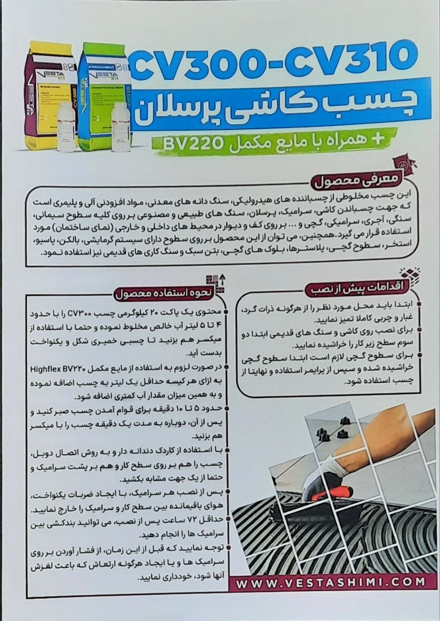 برای نصب سرامیک و یا پرسلان های سایز بزرگ بر روی دیوار، از مایع مکمل BV220، به ازای هر کیسه، حداقل یک لیتر استفاده شود. این مکمل باعـث افزایـش چسبنـدگی و همچنیـن تسـریع در زمـان خشک شـدن چسب می گــردد. از اضافه نمودن سایر مکمل ها، خود داری فرماییــد. یک لیتر مکمل به همراه ۳/۵ لیتر آب در یک ظرف مخلوط گردد. سپس یک پاکت چسب پـودری ۲۰ کیلویی آرام آرام به مواد اضـافه شده و بـا میکسـر مخلوط گردد. جهت نصب پرسلان، سرامیک و سنگ، حتماً از اتصال دوبل بـه این روش که ابتدا چسب را با استفاده از کاردک دندانه دار به پشت آنها کشیده و سپـس چسب را بر روی دیوار مورد نظر زده و با استفاده از انجام اتصال دوبل و ایجاد ضربات یکنواخت، باعث خارج شدن هوای سطوح شویـد.